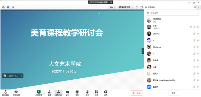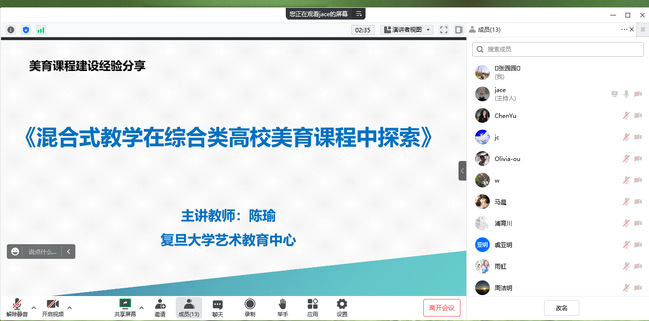 11月30日上午,学院邀请复旦大学艺术教育中心陈瑜老师做混合式课程建设研讨会。会上,陈瑜老师以《混合式教学在综合类高校美育课程中探索》为主题,重点介绍了她所开设的特色课程《合唱作品赏析与实践》(中级)的混合式教学建设情况。陈老师从混合式教学改革的理解与体会开篇,提出混合式教学就是整合传统教学和网络教学的优势。陈老师说,教学平台就是师生共存的课堂,要以“学”为中心,先学后教,以学定教贯穿教学全过程。陈老师在开展混合式教学过程中,通过“强互动”提供浸润式平台,借助微信群、学习通、邮箱等任务驱动,激发学生自主学习动力,强化价值引领,促进全过程育人。陈瑜老师讲座后,学院教师与陈瑜老师围绕如何提升线上教学效果、优化线上与线下教学内容占比和课程考核难度设置等方面进行深入交流与探讨。