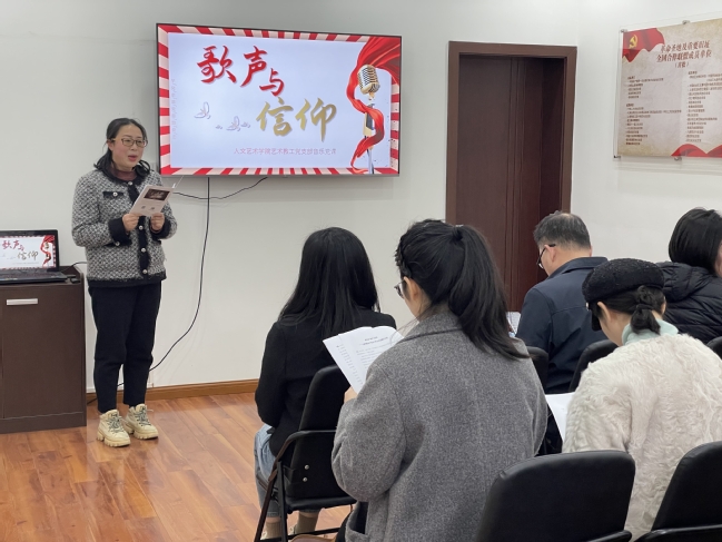 在纪念馆内,艺术教工党支部为全体教师带来了“歌声与信仰”系列音乐党课第一篇章——“国民革命战争时期的最强音”。艺术教工党支部书记许晶与党员张翯、高晓欧一起,以中共三大前后国民革命战争时期的史料为线索,将二十世纪二十年代诞生的革命音乐与共产党人精神谱系串联,带领全体教师一起聆听革命音乐,感受《国民革命歌》《红军纪律歌》等革命歌曲中蕴含的共产党人的伟大精神力量。
