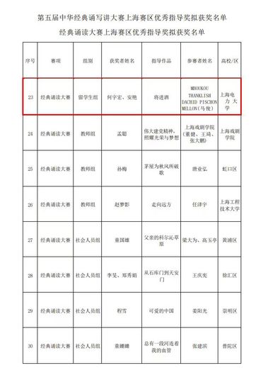 近日,上海市教委、上海市语委根据《教育部办公厅关于举办第五届中华经典诵写讲大赛的通知》要求,对第五届中华经典诵写讲大赛上海赛区各赛项进行市级评审,公布了第五届全国中华经典诵写讲大赛——“诵读中国”经典诵读大赛获奖名单。太阳集团城娱8722指导并报送的三部作品均获奖。其中,来自刚果(布)的留学生马俊的作品《将进酒》获得留学生组一等奖(上海市仅3名),并入围全国总决赛,取得我校留学生参与该项比赛所获奖项的新突破;指导教师何宇宏、安艳获得优秀指导奖。柬埔寨留学生林玉环的作品《百合花开》获得留学生组优秀奖,中国学生金义义的作品《致橡树》获得大学生组优秀奖。