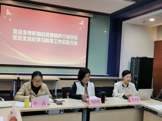 党总支书记周洁明传达了习近平总书记在二十届中央纪委三次全会上的重要讲话和全会精神,以及中央党的建设工作领导小组会议和市委常委会扩大会议暨市委党的建设工作领导小组会议、市教卫工作党委党的建设工作领导小组会议、学校党委党的建设和全面从严治党工作领导小组扩大会议精神。周洁明指出,要把开展党纪学习教育作为重要政治任务,对学院开展党纪学习教育提出了三点要求:一是要高度重视,确保学习教育有力推进;二是要精心组织,确保党员学习全覆盖;三是要扎实有效,确保推动学院的工作。