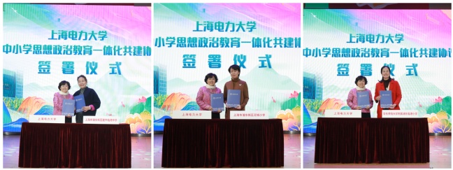 随后进行我校大中小学思想政治教育一体化共建协议签署仪式,校党委常委、宣传部部长张仙智分别与浦东新区建平临港中学校长陆英、泥城小学校长唐华英、华师大临港附小副校长孙敏签约,协力打造育人品牌,为提升大中小学思政育人实效打下基础。